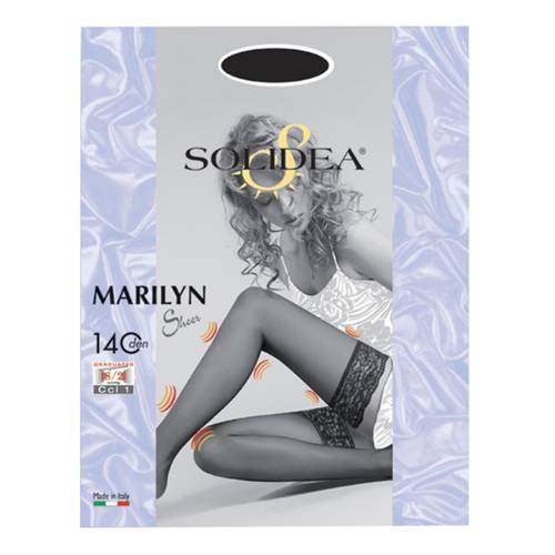 Calza autoreggente 140 denari a maglia liscia. Particolarmente velata ed elegante, con morbida balza in pizzo. La compressione graduata 18/21 mmHg aiuta la circolazione sanguigna ed evita l’aggravarsi di problemi da insufficienza venosa. Con soletta anatomica anti-stress.