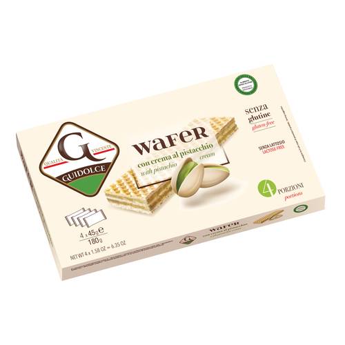 Wafers farciti con crema al pistacchio (crema 75%) senza glutine. Specificamente formulato per persone intolleranti al glutine.